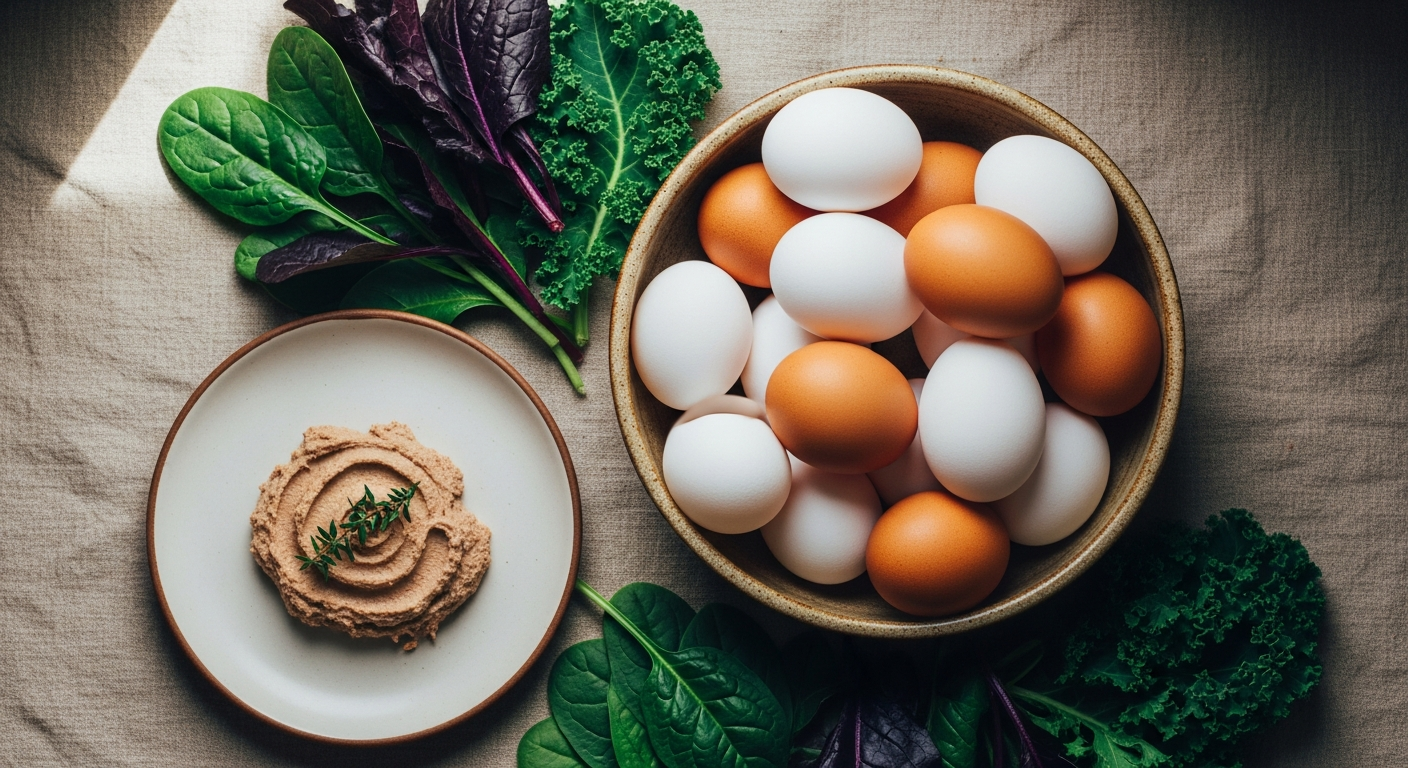 Eieren, lever en groene bladgroenten als bronnen van choline op een houten snijplank
