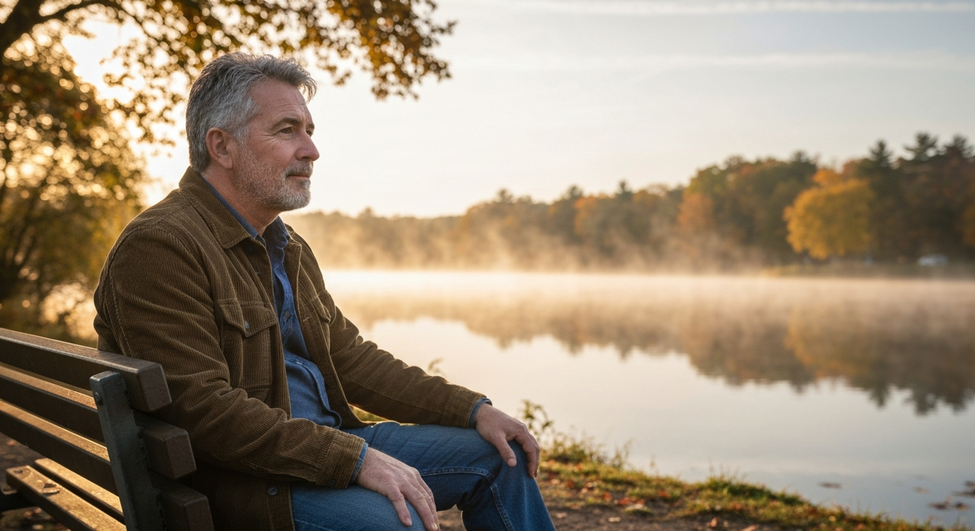 Man op een parkbank in de herfst die uitkijkt over een meer met ochtendmist
